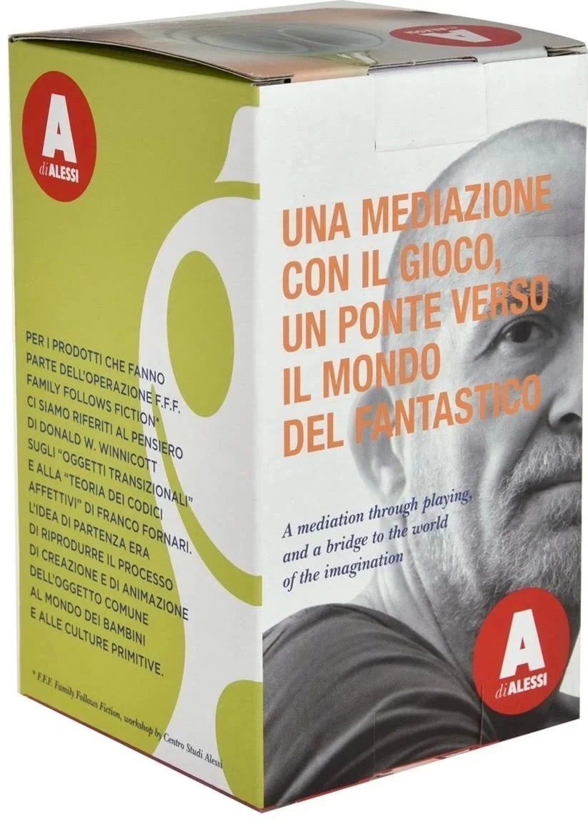 Guido Venturini verschuilt zijn passie voor ‘space management’ en binnenhuisarchitectuur niet bij het ontwerpen van zijn producten voor de kunststof collectie van Alessi. Hij brengt met de Gino Zucchino een speelse meditatie en een brug naar de wereld van de fantasie.